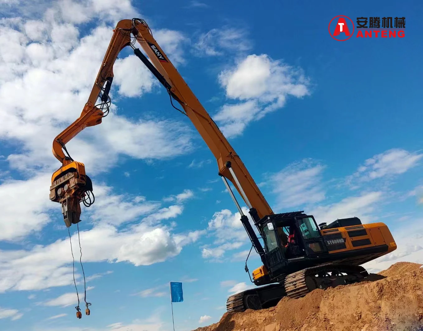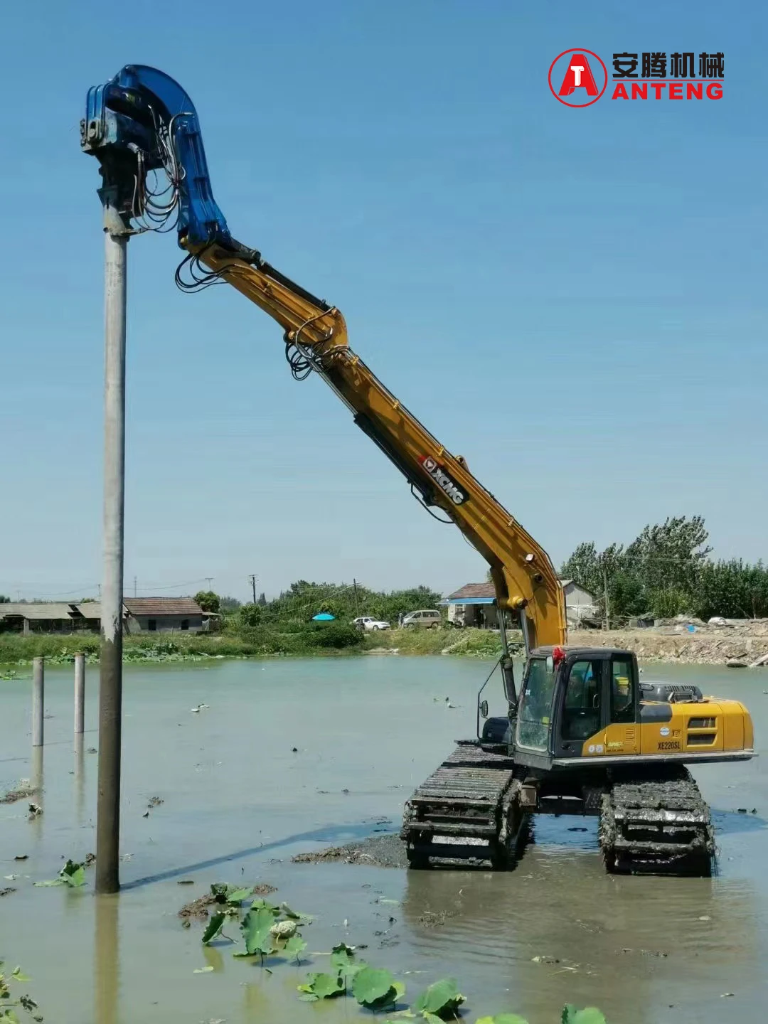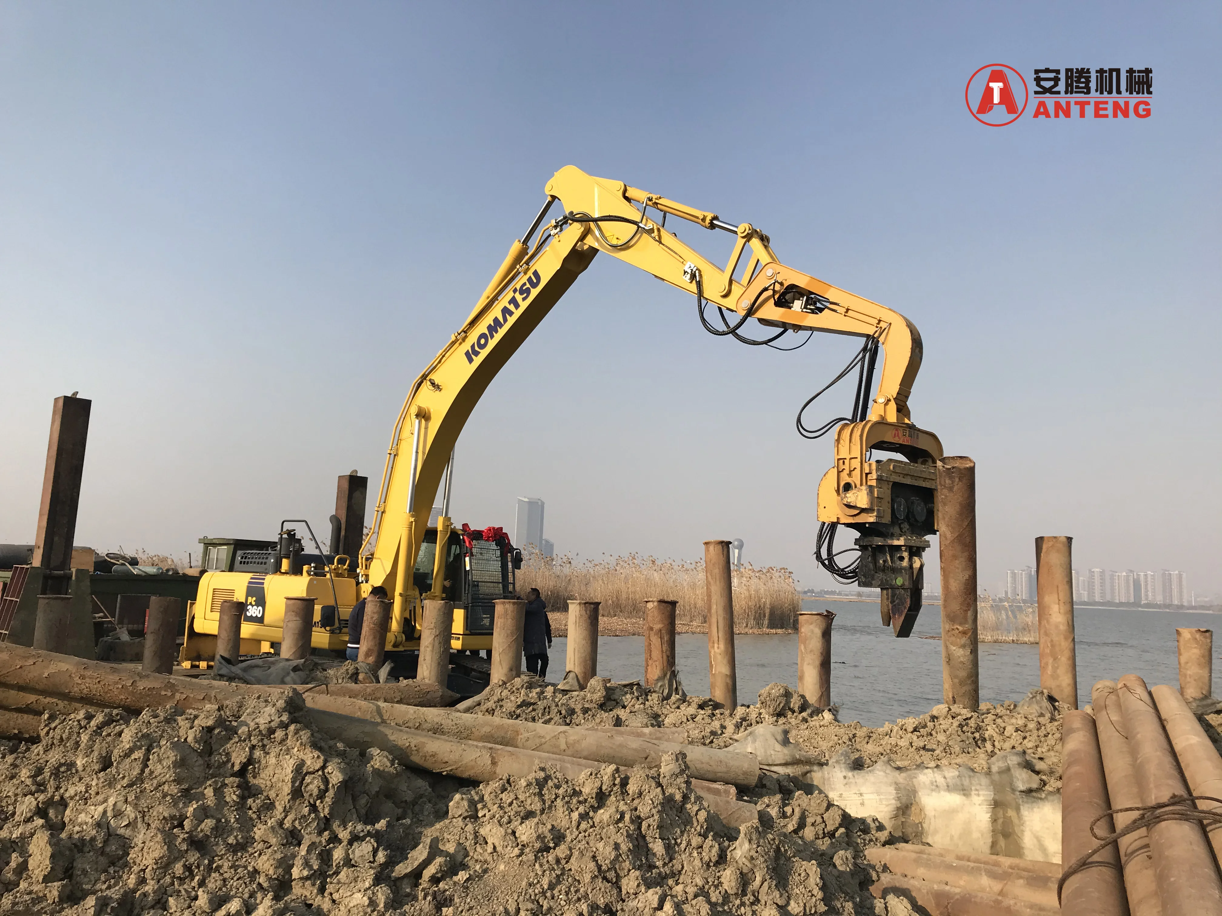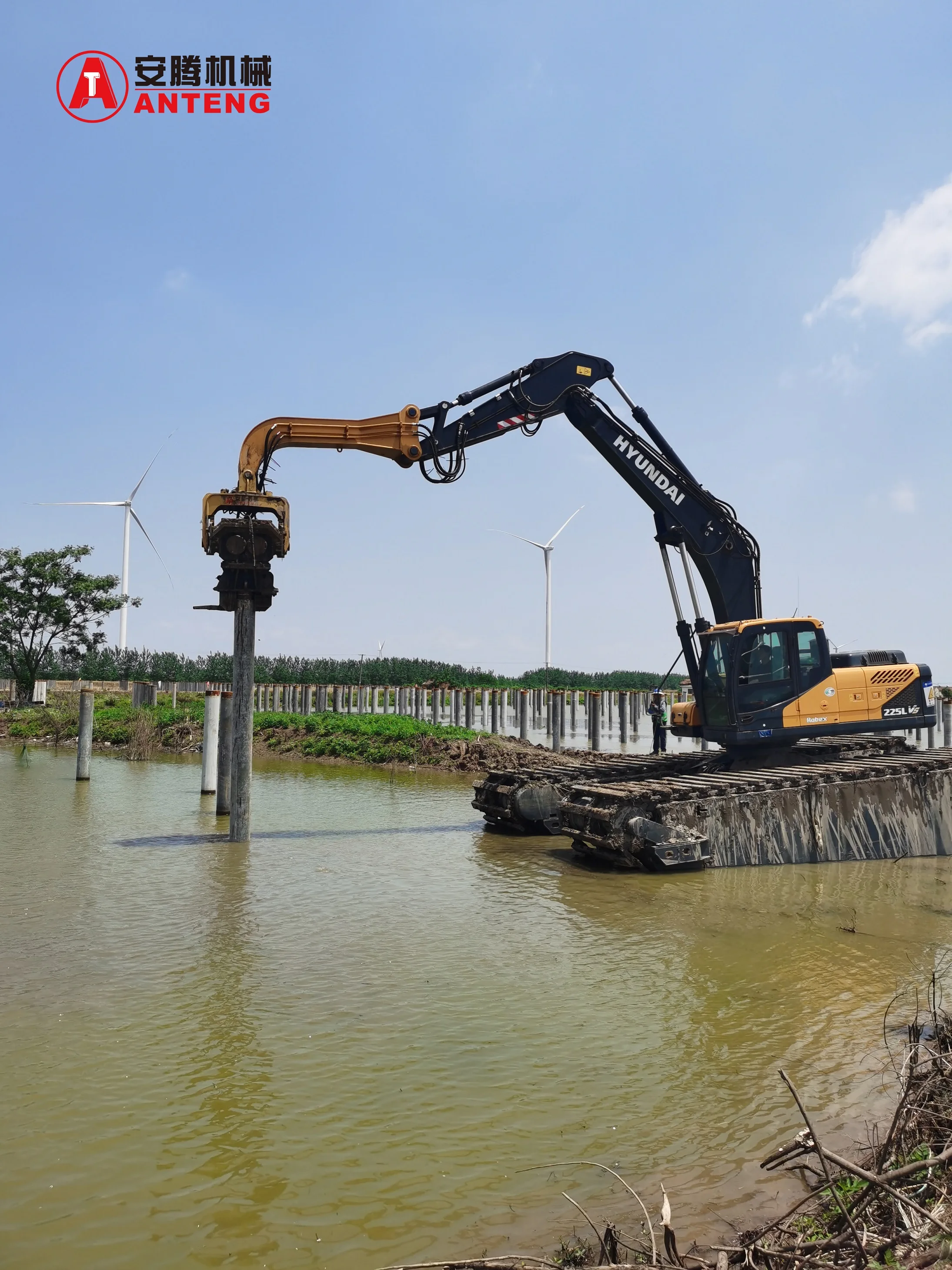 Los martillos de pilotes ANTENG son del tipo vibratorio, de alta frecuencia y se montan en excavadoras, para manipular, inclinar, hincar y extraer distintos tipos de pilotes en una amplia gama de condiciones del terreno y del suelo. Equipados con mordazas capaces de hinca una amplia gama de pilotes, incluyendo tablestacas, pilotes H, pilotes I, pilotes tubulares de acero, pilotes cuadrados de hormigón y otros tipos de secciones de pilotes.