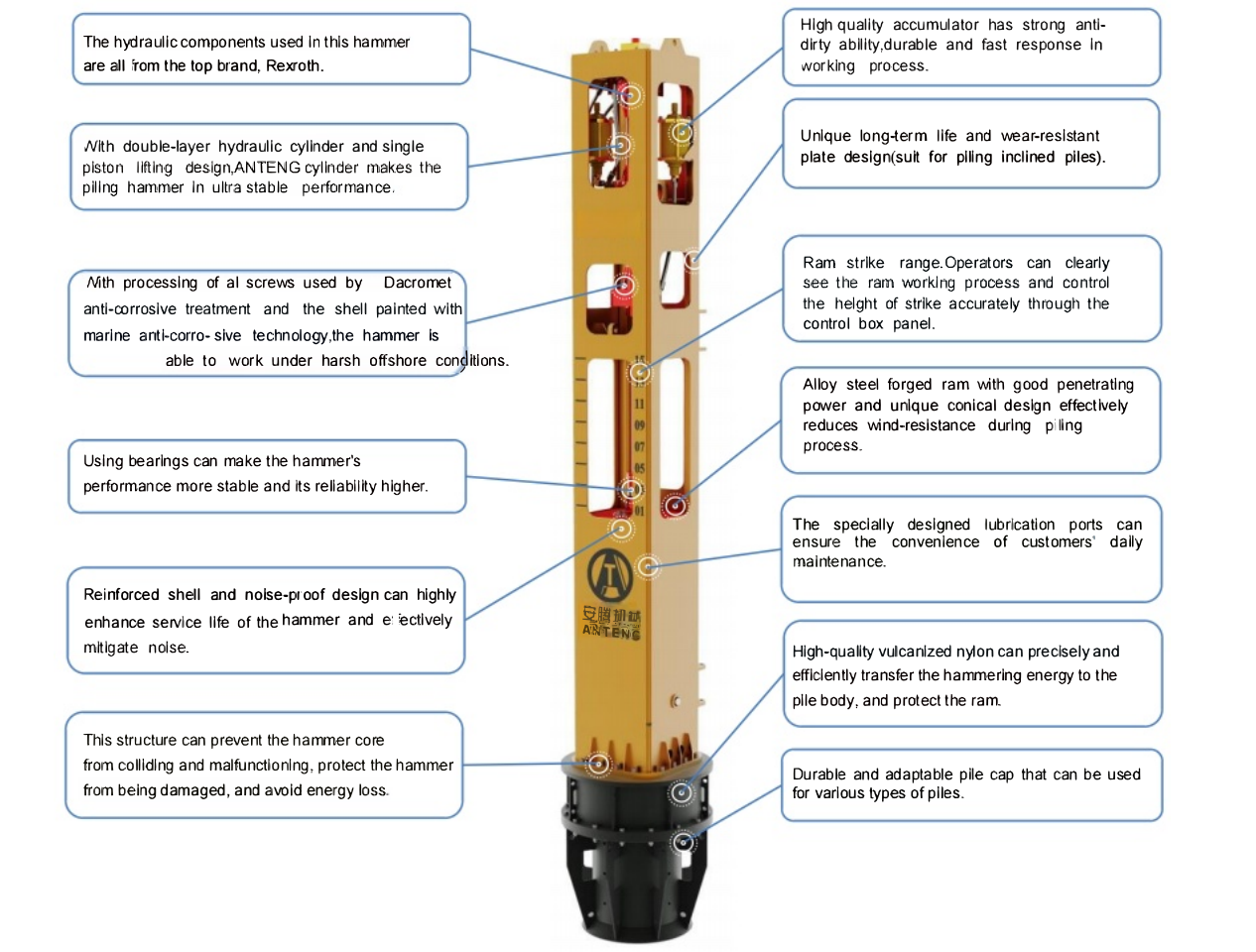 डबल-लेयर हाइड्रोलिक सिलेंडर डबल-लेयर हाइड्रोलिक सिलेंडर और सिंगल पिस्टन लिफ्टिंग डिज़ाइन पाइलिंग हथौड़े को अत्यधिक स्थिर प्रदर्शन प्रदान करते हैं। |